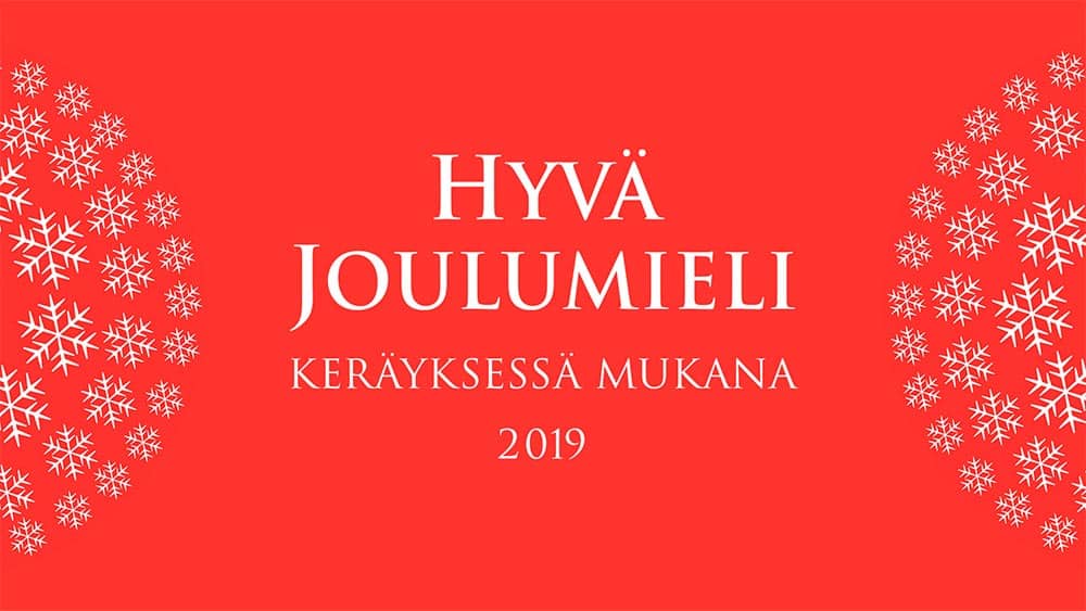 Lahjoitimme vuoden 2019 joulutervehdysvarat Hyvä Joulumieli -keräykseen. Keräyksen järjestävät Mannerheimin Lastensuojeluliitto ja Suomen Punainen Risti yhdessä Ylen kanssa.