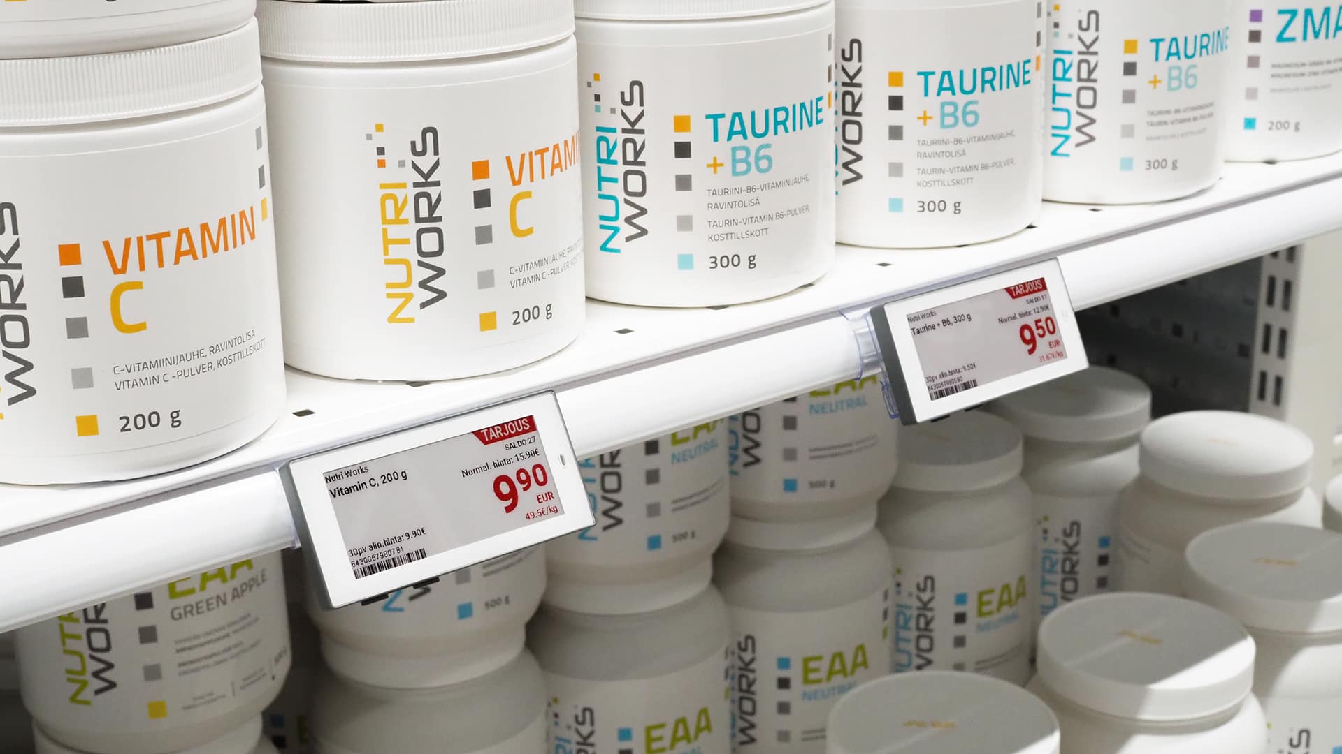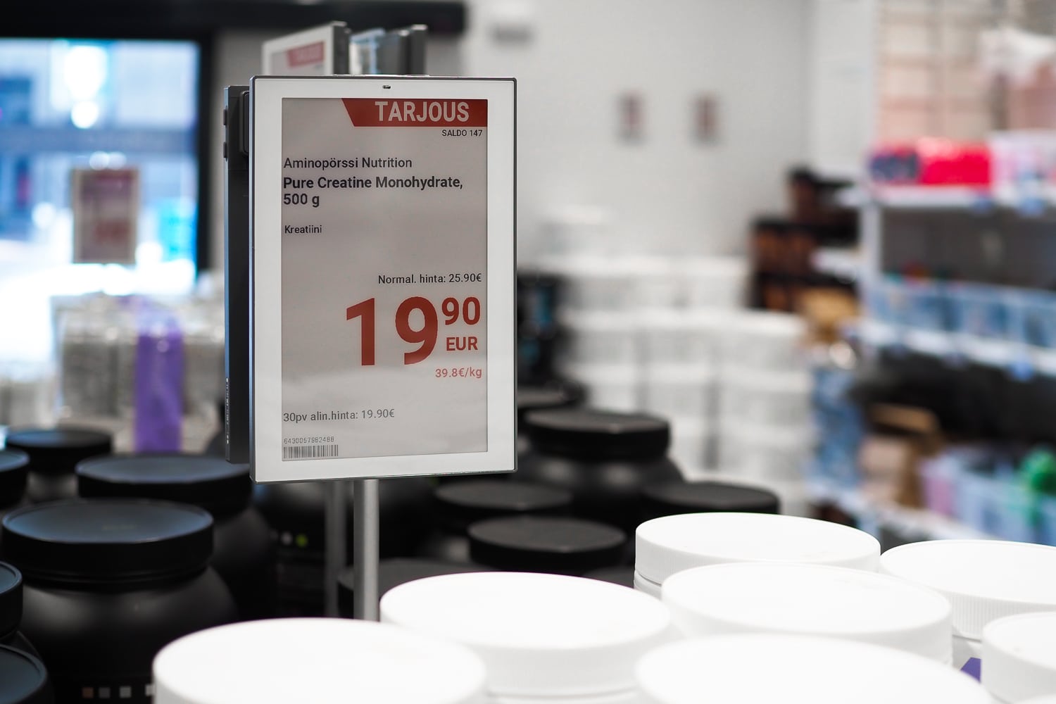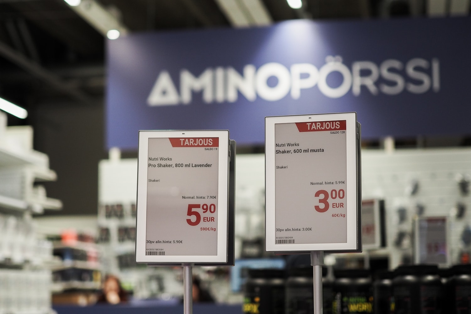 Hyvinvointiin ja treenaamiseen erikoistunut Aminopörssi (Nutrimarket Oy) myy lisäravinteita ja treenivaatteita sekä verkkokaupassaan että Helsingissä sijaitsevassa myymälässään. Yrityksen valikoimaan kuuluu tuhansia tuotteita ja kampanjoita toteutetaan viikoittain, tarkoittaen satoja hintamuutoksia joko kampanjahintaiseksi tai takaisin normaalihintaiseksi. Haasteeksi muodostui se, ettei myymälässä pystytty esittämään samoja kampanjoita kuin verkkokaupassa. Eri hinnat myymälässä ja verkkokaupassa aiheuttivat hämmennystä myymälän asiakkaissa ja työllistivät turhaan henkilökuntaa. Ratkaisuksi ongelmaan löydettiin EWQ:n sähköinen hintanäyttöjärjestelmä (ESL), joka varmistaa, että verkkokaupan ja myymälän hinnat ovat aina identtiset. Verkkokauppa hyödyntää Shopify-alustaa, johon rakennetun integraation seurauksena hintamuutokset valuvat sekunneissa verkkokaupasta myymälän elektronisille hintanäytöille. EWQ:n ratkaisun ansiosta Aminopörssin tuotemenekki ja keskiostos ovat kasvaneet.