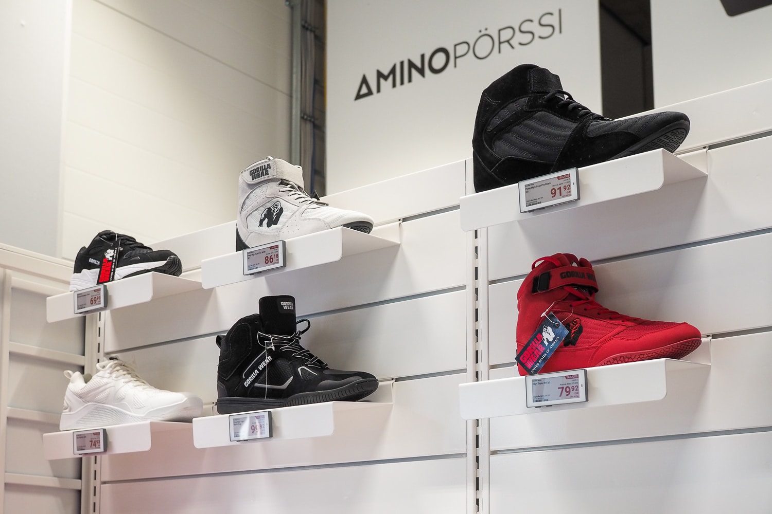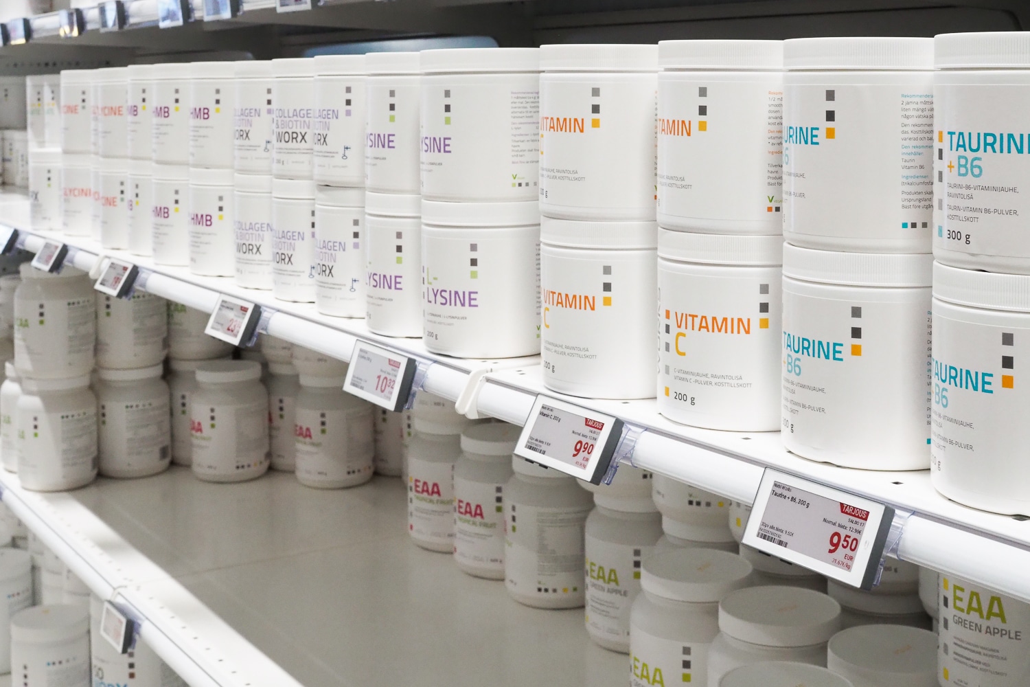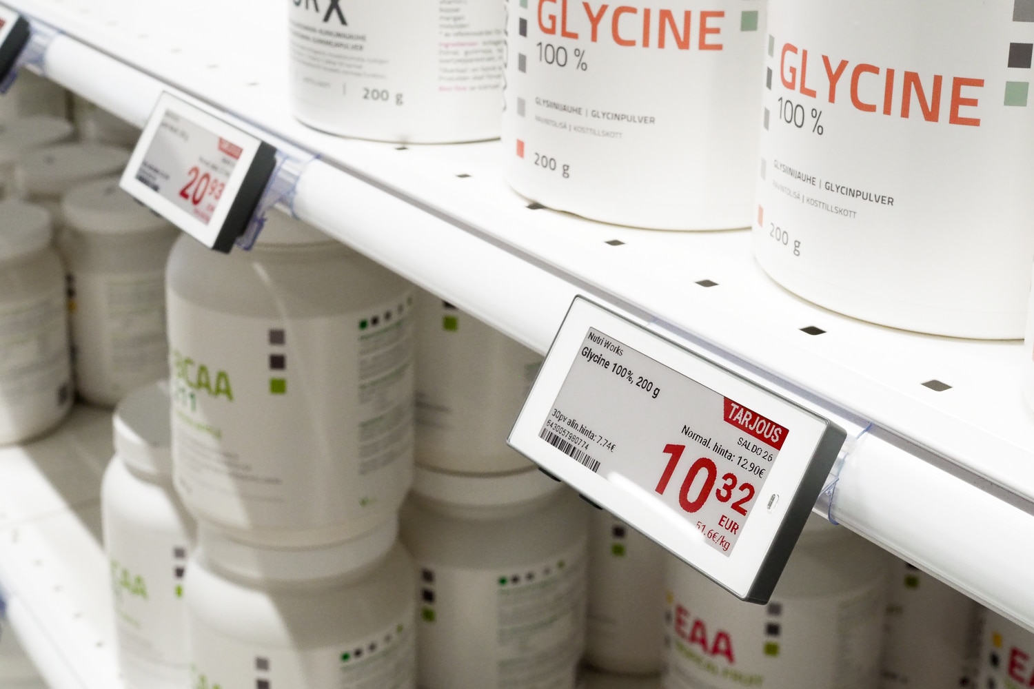Hyvinvointiin ja treenaamiseen erikoistunut Aminopörssi (Nutrimarket Oy) myy lisäravinteita ja treenivaatteita sekä verkkokaupassaan että Helsingissä sijaitsevassa myymälässään. Yrityksen valikoimaan kuuluu tuhansia tuotteita ja kampanjoita toteutetaan viikoittain, tarkoittaen satoja hintamuutoksia joko kampanjahintaiseksi tai takaisin normaalihintaiseksi. Haasteeksi muodostui se, ettei myymälässä pystytty esittämään samoja kampanjoita kuin verkkokaupassa. Eri hinnat myymälässä ja verkkokaupassa aiheuttivat hämmennystä myymälän asiakkaissa ja työllistivät turhaan henkilökuntaa. Ratkaisuksi ongelmaan löydettiin EWQ:n sähköinen hintanäyttöjärjestelmä (ESL), joka varmistaa, että verkkokaupan ja myymälän hinnat ovat aina identtiset. Verkkokauppa hyödyntää Shopify-alustaa, johon rakennetun integraation seurauksena hintamuutokset valuvat sekunneissa verkkokaupasta myymälän elektronisille hintanäytöille. EWQ:n ratkaisun ansiosta Aminopörssin tuotemenekki ja keskiostos ovat kasvaneet.