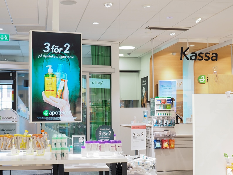 Ruotsin suurin apteekkiketju, Apoteket, on valinnut EWQ:n näyttöratkaisuiden toimittajaksi! Melkein neljäsataa toimipaikkaa ympäri Ruotsia, hyödyntävät digitaalisia näyttöjä mm. tarjouksien esittämisessä, imagomainonnassa ja sisäisessä sekä ulkoisessa tiedottamisessa. Näyttöjä on sijoitettu ympäri myymälää varmistamaan mahdollisimman hyvä näkyvyys; ikkunoihin sekä ulos että sisäänpäin, kampanjapöydille sekä kassan ja tuotteiden luokse.