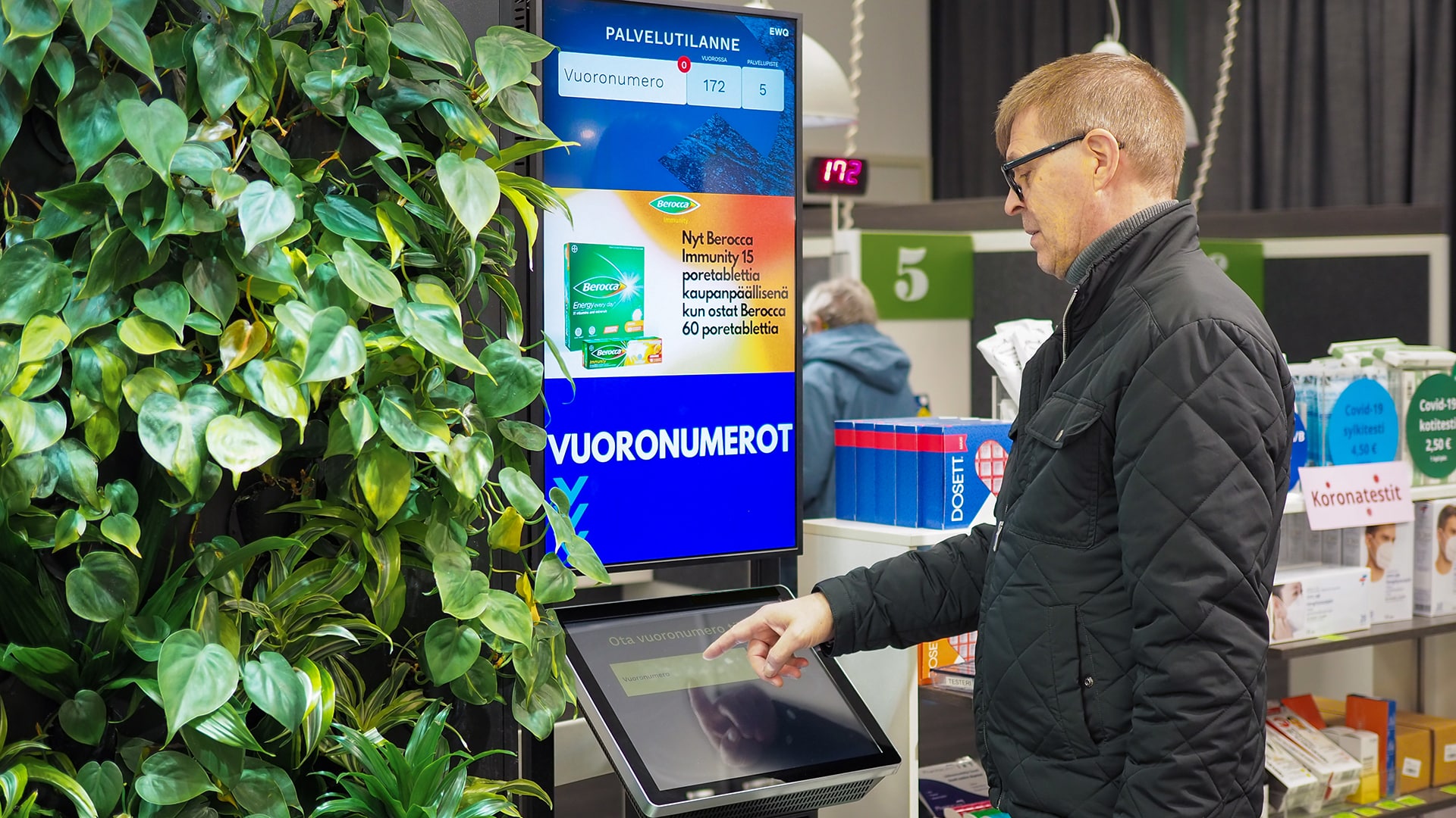 EWQ-Touch lippuautomaatti ja suoraan sen yläpuolella oleva digitaalinen infonäyttö ovat erinomaisia apuvälineitä asiakasviestinnässä. Haka Apteekissa infonäyttö esittää asiointia helpottavia vinkkejä, aukiolotiedotteita ja mainosmateriaalia.