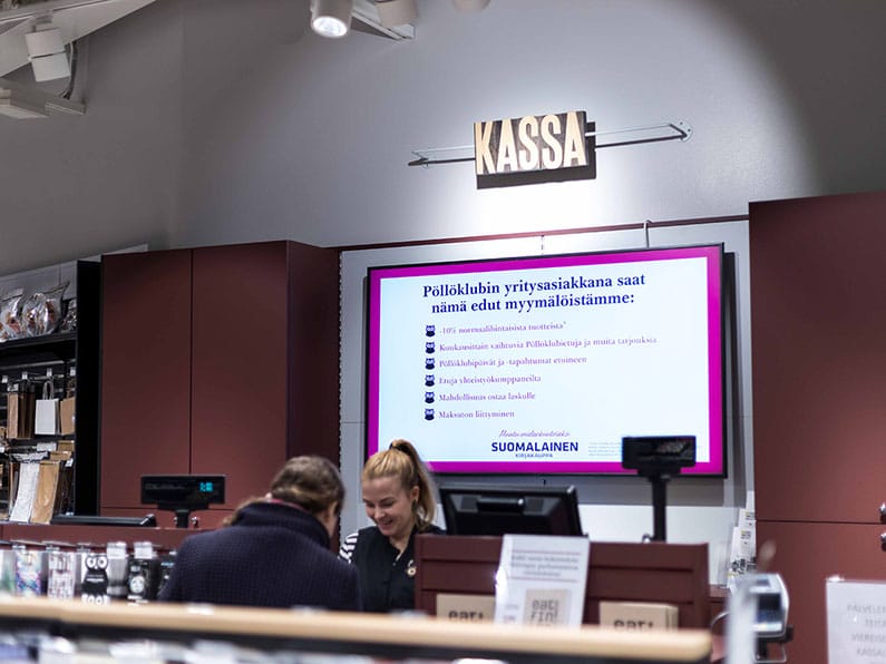 Suomalaisen Kirjakaupan DS-näytöiltä esitettävä materiaali tuottaa kasvavaa positiivista huomioarvoa ja herättää aktivoivaa mielenkiintoa ketjun konseptia kohtaan, unohtamatta kasvavaa asiakasvirtaa. Marraskuussa avatussa lippulaivamyymälässä keskellä Helsingin Aleksanterinkatua, kymmenet digitaaliset näytöt ovat osa myymälän sisustuskonseptia, tuoden oman lisänsä rentoon kirjanystävien olohuonemaiseen ympäristöön. Suuri, vilkkaalle kadulle suunnattu 75″ ikkunanäyttö houkuttelee ohikulkijoita astumaan sisään kirjaystävien maailmaan. Näytöiltä esitetään mm. lainauksia kuuluisilta kirjailijoilta, tulevaa ohjelmistoa kirjailijavieraista ja uutuuskirjoista sekä tottakai ajankohtaisia kampanjoita sekä Pöllöklubin kanta-asiakastarjouksia.